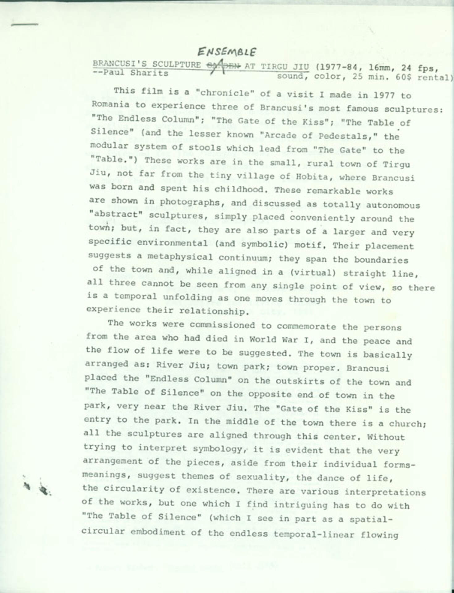 This film is a “chronicle” of a visit I made in 1977 to Romania to experience three of Brancusi’s most famous sculptures: “The Endless Column”; “The Gate of the Kiss”; “The Table of the Silence” (and the lesser known “Arcade of the Pedestals,” the modular system of the stools which lead from “The Gate” to the “Table.”) These works are in the small, rural town of Tirgu Jiu, not far from the tiny village of Hobita, where Brancusi was born and spent his childhood. These remarkable works are shown in photographs, and discussed as totally autonomous “abstract” sculptures, simply placed conveniently around the town; but, in fact, they are also parts of a larger and very specific environmental (and symbolic) motif. Their placement suggests a metaphysical continuum; they span the boundaries of the town and, while aligned in a (virtual) straight line, all three cannot be seen from any single point of view, so there is a temporal unfolding as one moves through the town to experience their relationship.