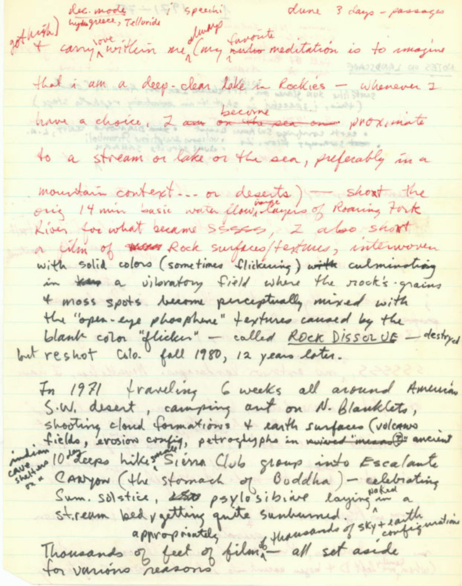 …and carry love within me always (my favorite mediation is to imagine that I am a deep-clear lake in the Rockies—whenever I have a choice, I am on the sea or become proximate to a stream or lake or the sea, preferably in a mountain context---or deserts)—shoot the orig 14 min basic water flow image layers of roaring fork river for what became SSSSS, I also shot a film of rock surface/textures, interwoven with solid colors (sometimes flickering) with culminating in a vibratory field where the rock’s grains and moss spots become perceptually mixed with the “open-eye phosphone” textures caused by the blank color “flicker”—called ROCK DISSOLVE—destroyed but reshot Colo. Fall 1980, 12 years later.