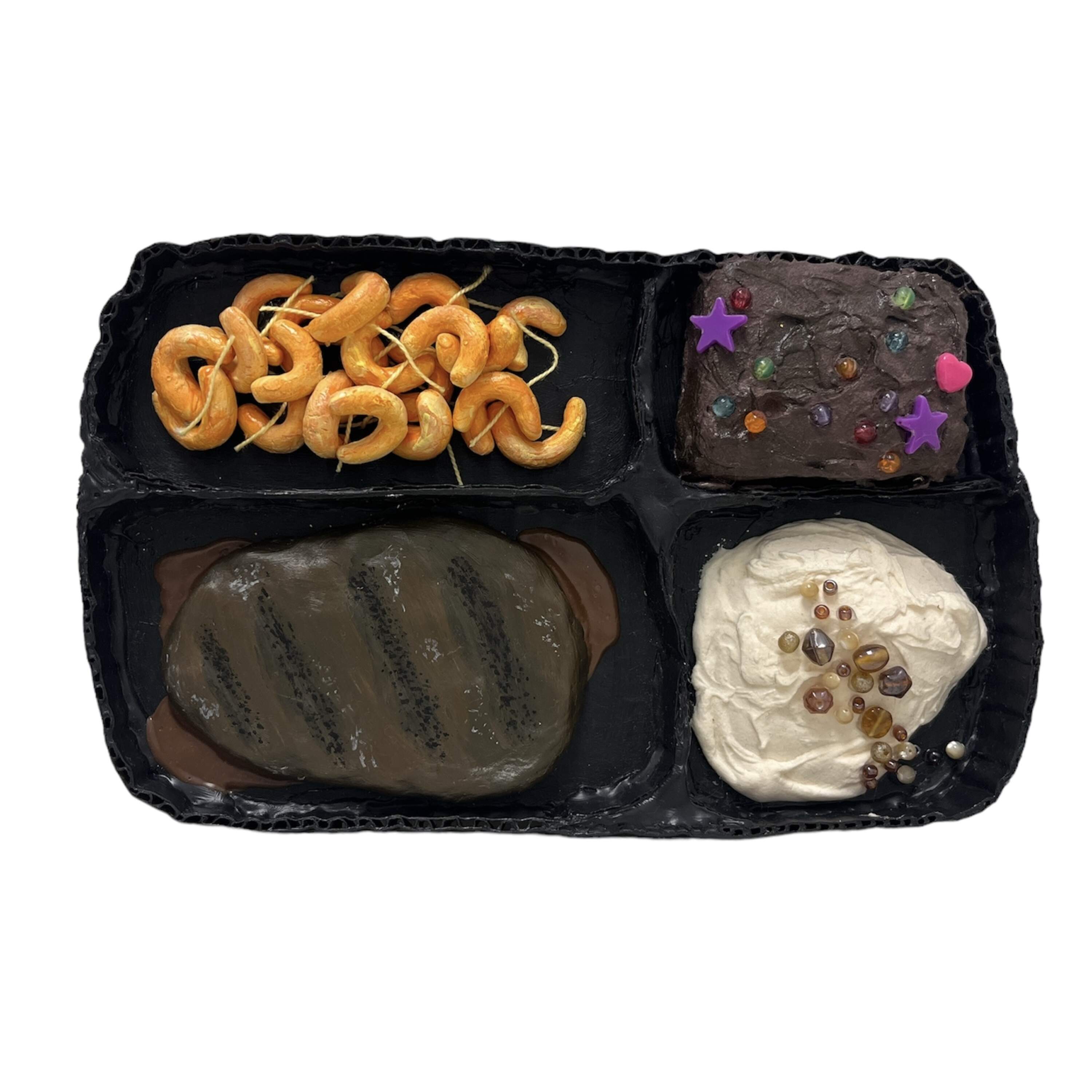 "This installation will activate the lockers, hallway, & coat room area with mixed media and sculptural objects which provoke a sense of nostalgia and replicate recognizable grade-school items. Some lockers will be left opened and staged with sculptural school supplies and imaginative objects that might exist in an alternate reality, giving viewers a sense of peering into someone’s personal storage space. Large-scale crochet, sewn, and beaded tapestries replicating school lunch trays with common meals will also be made to be hung along the wall or even pinched between closed lockers. Other tapestries will also include: a composition notebook cover and a giant stuffed calculator. Lastly, a 3-foot tall crochet crayon and crochet pencil will be created and set next to a life-sized cardboard school desk and chair sculpture. The inclusion of bright colors, multiple mediums, and content that spark childhood nostalgia will further enhance this space and create a dream-like world for people to wander through." – Alison Cortes