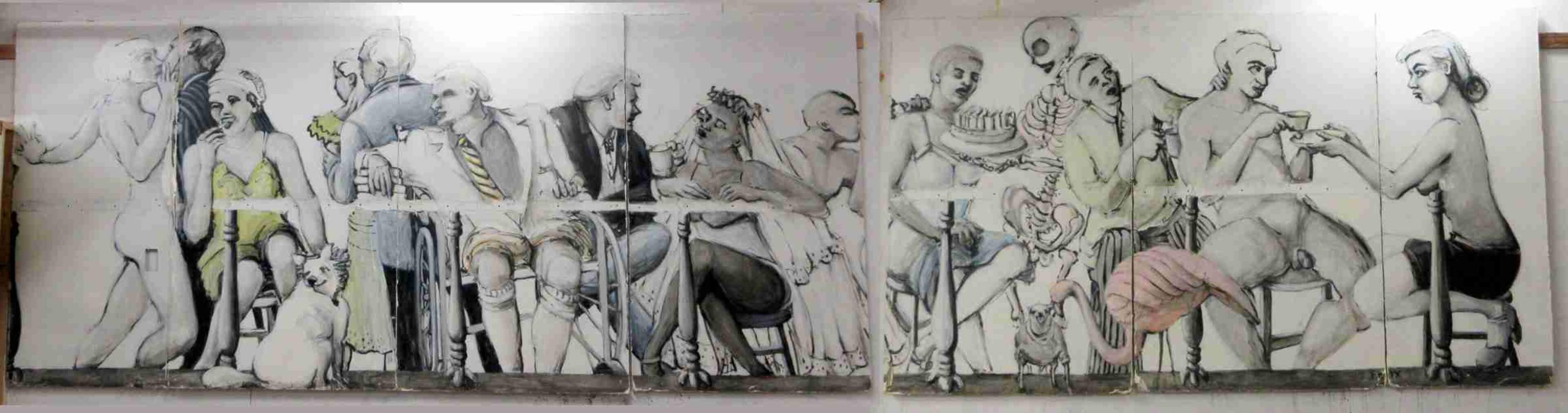 Jackie's way of playing with iconic subjects is represented in a momunental work she created at Hallwalls in the summer of 1996, a 22-foot-long mural of fourteen figures in the space opposite the entrance to the gallery. Arranged in a manner reminiscent of Leonardo da Vinci's fresco The Last Supper, these figures congregate by a flat surface (in this case a bar, rather than a table). This functional bar, extending across the entire length of the mural, bisects all of the figures at the waist or lower chest, creating two regions. Above the bar's surface seemed to be a public realm of events, while below, further obscured by bar stools, is a shadowed nether land of hidden gestures and sexual suggestions. The figures are larger than life, the wall a rhythm of activity, drawn and painted in muted fresco-like colors of black, white and grey with hints of color. -Sara Kellner