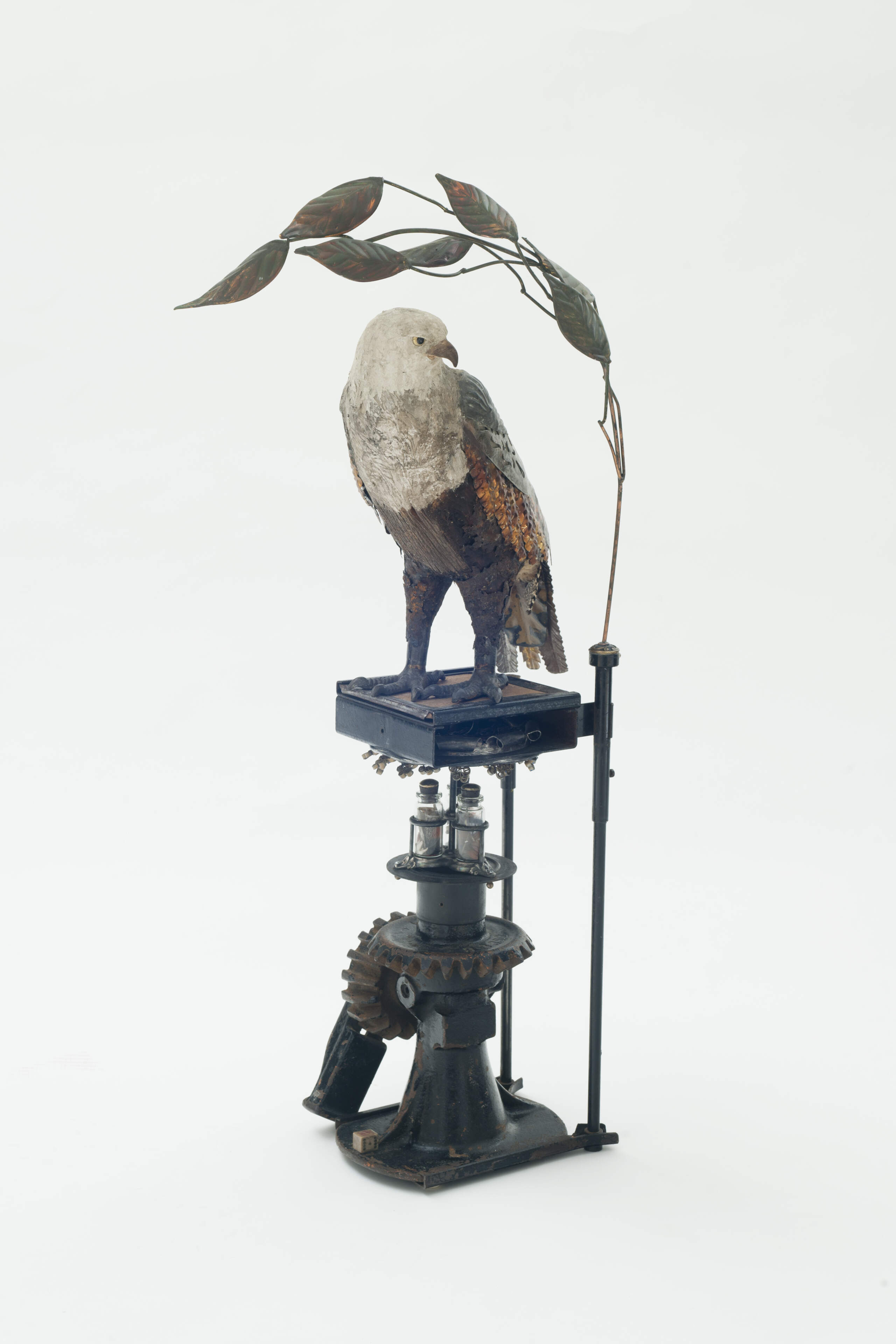 mixed media including parts of: car jack, vintage photo enlarger, condiment server, pie servers, lamp parts, shells, and feathers