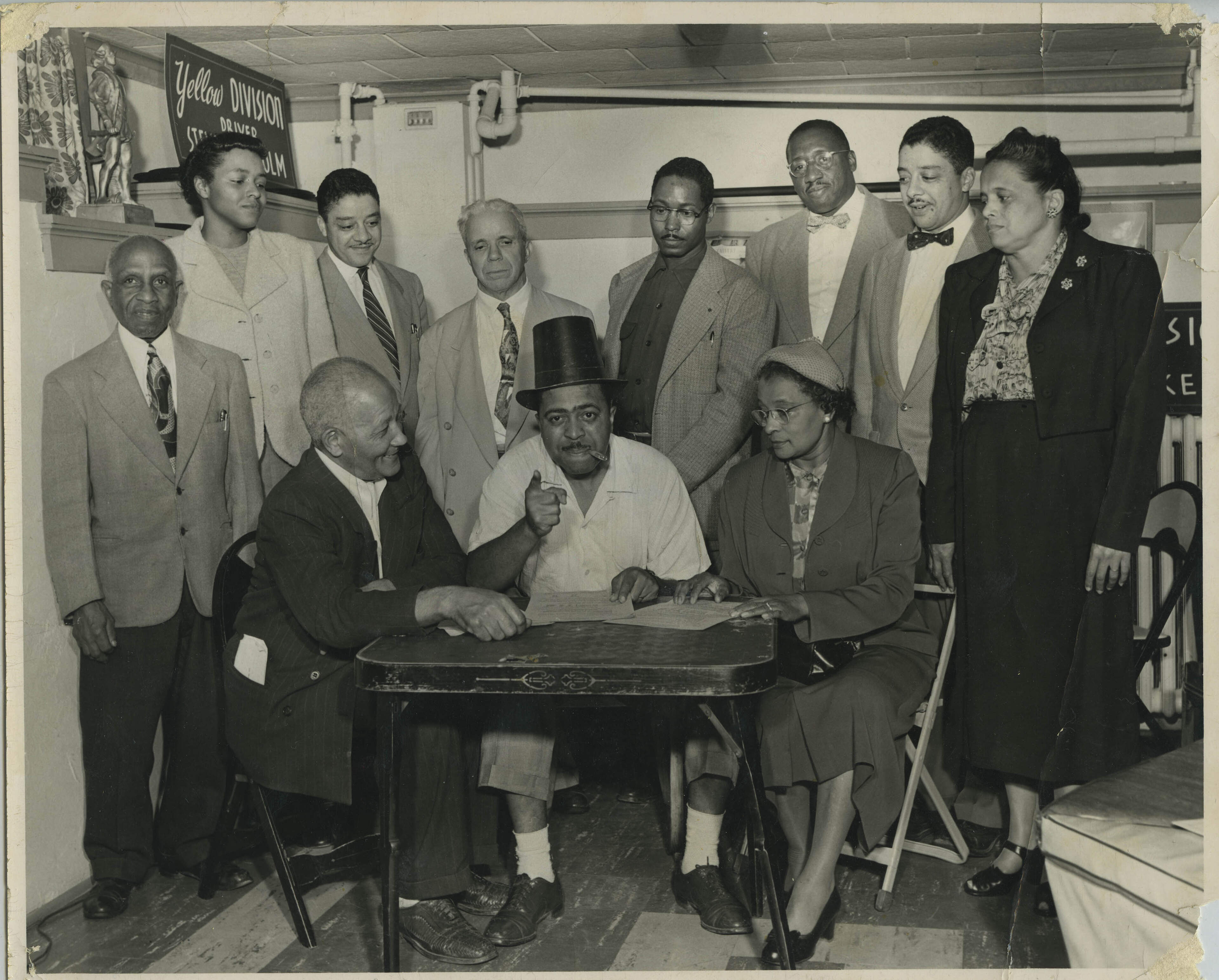 Brent, man in top hat [Count Basie?], and woman at table, 8 people standing behind them
