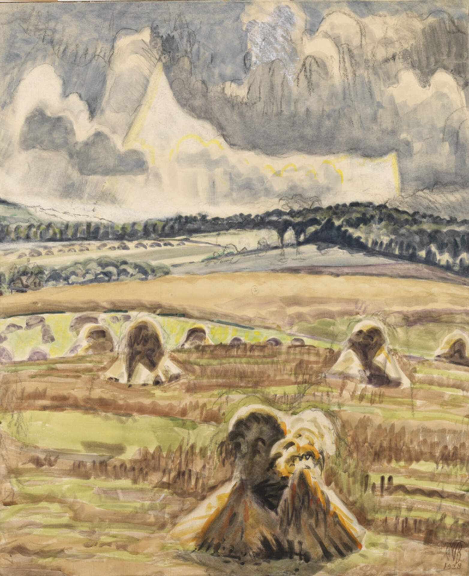 As I drove on later, I turned right on a road leading southward; and after passing thru a dense woods I came upon a little swamp, and with a sudden realization I almost exclaimed aloud – “This is the place”! quite by accident, I had found our elusive road, which was indeed, just beyond the swamp. I turned in on it, and went up over the hills. Here, I found my painting subject in an oat field, partly cut & shocked, with the hot sun pouring down on it, and with misty clouds in the hot white sky; — I spent the afternoon here.