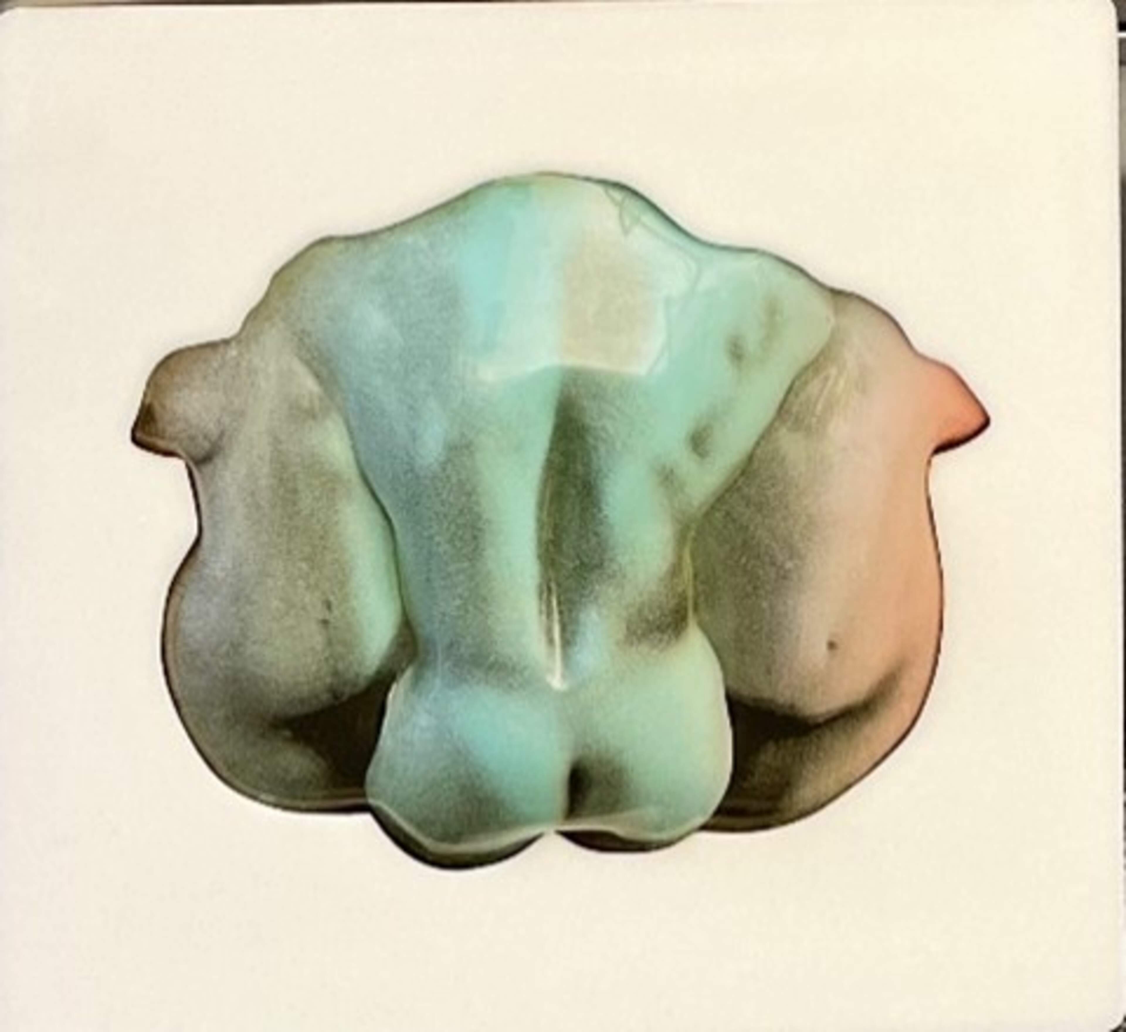 photographic screen print on heat formed plastic, surrounded by opaque white plastic