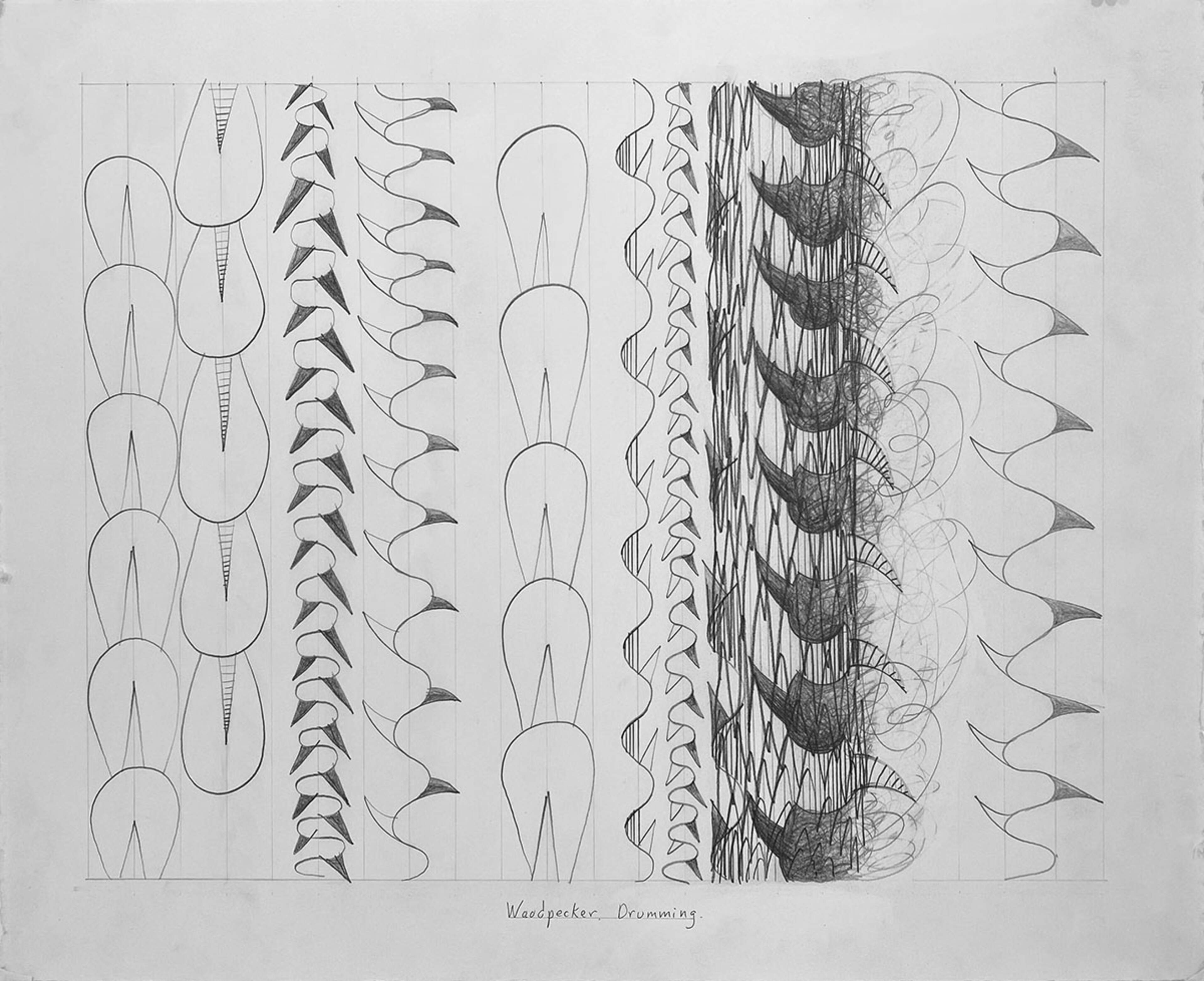 MG: My woodpecker drawing was made sitting under the low branches of a tree at the edge of a bright meadow in Northern New Mexico. I was watching a coyote hunt for mice when I heard a woodpecker drumming very loudly in the distance. Soon, another woodpecker responded and the two of them carried on like percussionists at a jazz club smack-down. While they were performing, I was drawing the sound, using a lot of pointed shapes to represent the impact and intensity, but also waves to describe the undulations and balloon shapes to capture the echoing volume. There are even some zig zags in a column to represent the tree bark that was being hammered to shreds as I listened. This process is like building a grammar to communicate a special moment, but with visual abstractions instead of words.
