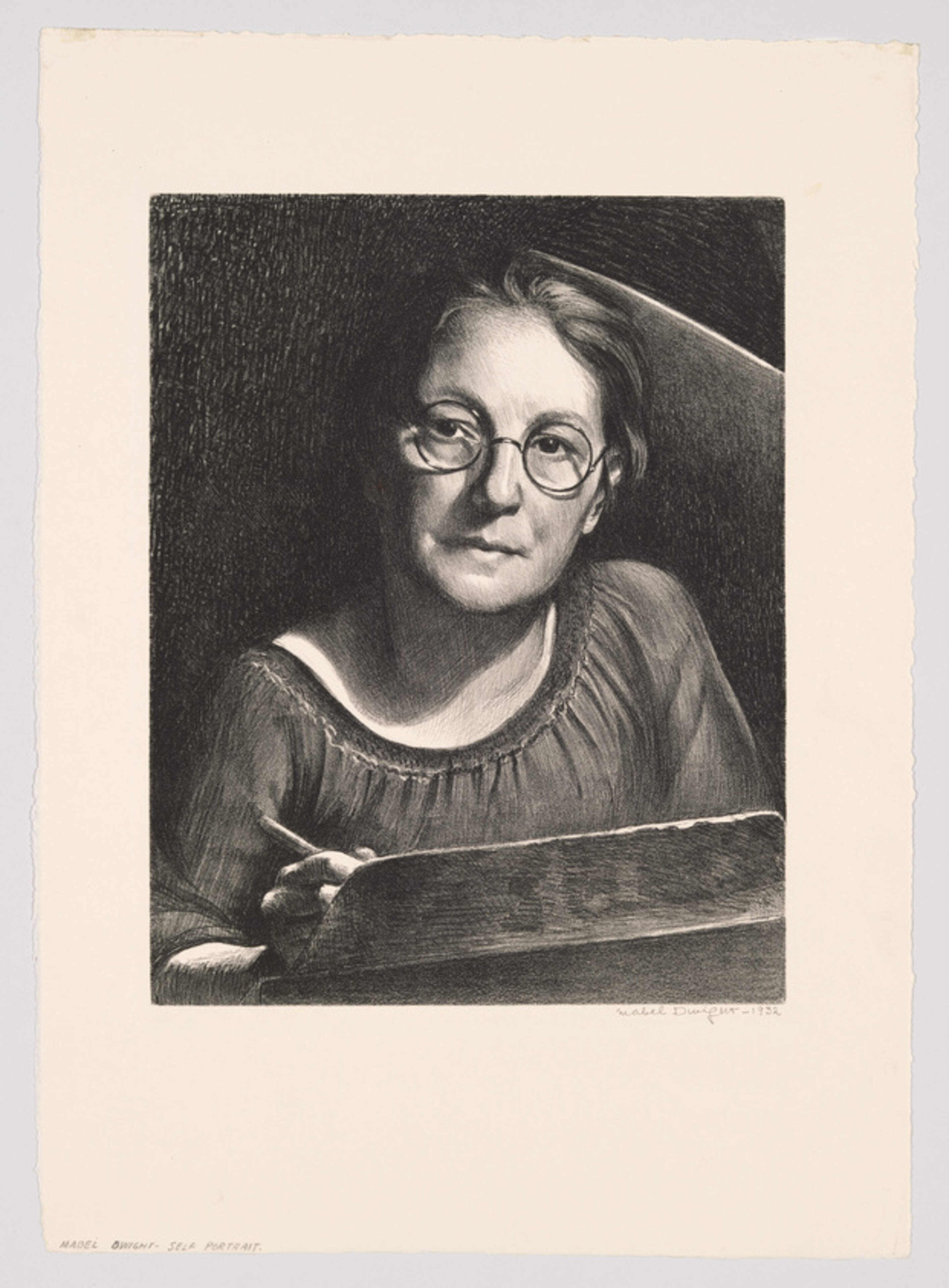 In 1926-27, Dwight lived in Paris, where she made her first lithographs at the Atelier Duchâtel. Her first solo exhibition, featuring recent prints and drawings, took place at the Weyhe Gallery in New York in 1928. Lithography became Dwight's primary medium; she would make 111 editioned lithographs in the course of her career. In her scenes of ordinary life, she compassionately parodied the foibles of fellow Americans, particularly New Yorkers. She also created images critical of Fascism and injustice. During the depression, she produced many prints under the auspices of federal artists' relief projects. By that time, Dwight had found support from both private collectors and museums. Her artistic activity waned with her declining health after 1941. Dwight spent her last years writing her autobiography, which was never published. (https://collection.terraamericanart.org/people/25/mabel-dwight)